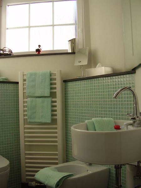Elegantes Badezimmer mit flacher Dusche, Bidet, Waschbecken und WC. Hand & Badetüchern, Bademänteln, Fön sowie Handtuchtrockner.