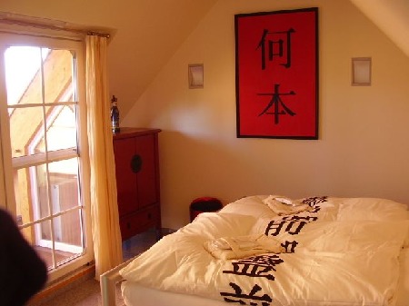Im Obergeschoß befindet sich das Schlafzimmer welches im eleganten japanischen Stil eingerichtet ist. Das große Doppelbett in Komforthöhe mit hochwertigen Matratzen und verstellbaren Lattenrosten. Im Hochzeitsschrank befindet sich der Safe und zusätzliche Decken und Kissen. Von hieraus geht es auch auf die große Terrasse die mit Designer-Gartenmöbeln ausgestattet ist.