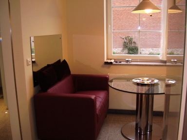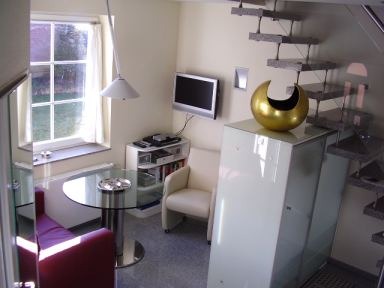 Wohn-Eßbereich im modernen Design mit Flachbildschirm-Fernseher, DVD, CD und Radio. Sofa und Sessel sowie Glas Eßtisch sorgen für erholsame Entspannung.