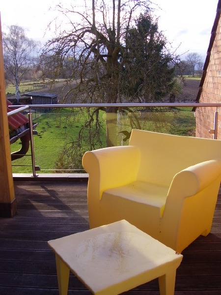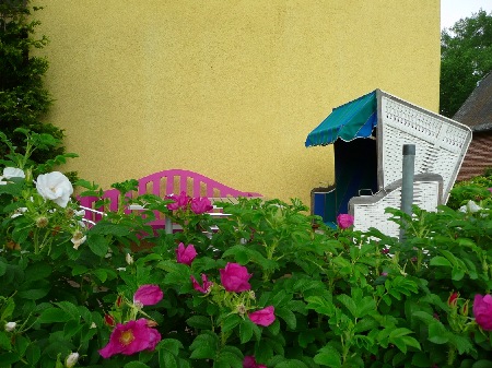 Eigene große Terrasse im Obergeschoß und eigene Sonnenterrasse mit Strandkorb, Liegestühlen und Frühstücksplatz neben dem Haus.